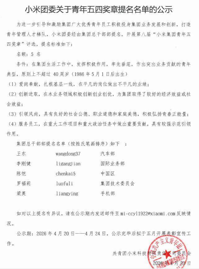 凭证该《公示》,为进一步带领和引发集团纷乱优秀后生职工积极投身集团业务发展和立异,打造后生惩处东谈主才梯队,小米团委过程集团总干部部提名,开展第八届“小米集团后生五四奖章”评比。